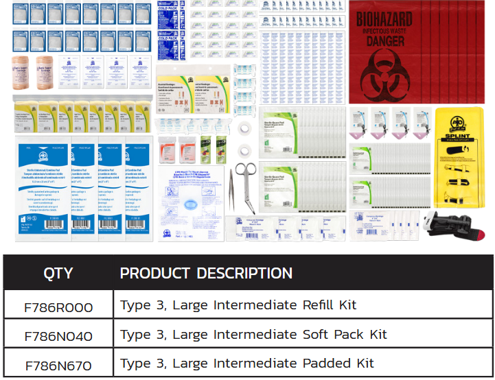 First Aid Kit Refill Pack Type 3 Large Intermediate F786R000 is a durable, CSA Z1220‑17 compliant workplace first aid solution. It is a suitable kit for 51–100 workers/shift and helps maintain compliance with provincial requirements. The kit contents are thoughtfully curated for common injuries, sanitation, and safe handling. Its organized layout supports quick access in high‑stress situations while reducing restock time. Mud Creek Medics is a trusted Canadian supplier serving diverse industries across Canada.